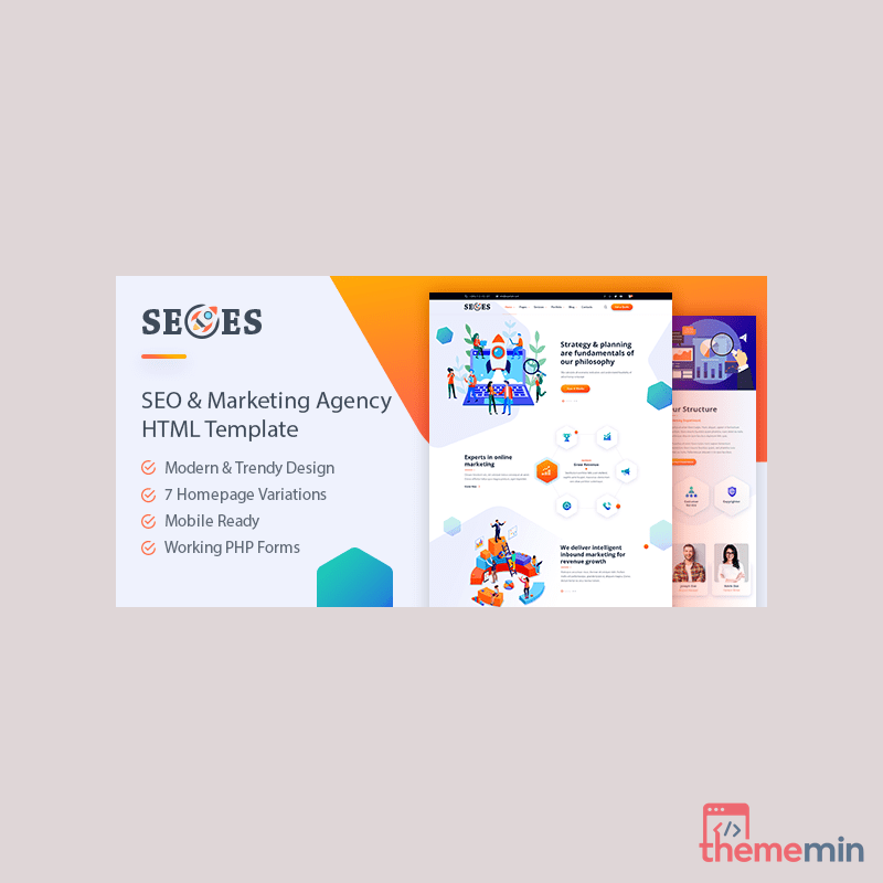 Seoes – Marketing Agency HTML Template is a professional HTML template for marketing agencies. Featuring a modern design, clear service presentation sections, and impressive portfolios, this template helps you showcase your expertise and attract potential clients in the digital marketing industry.